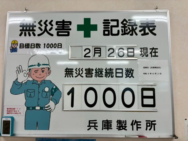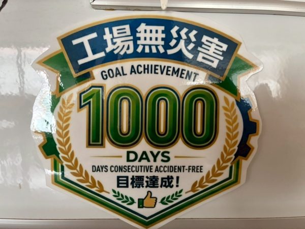 本社工場の無災害日数が1000日を達成しました。
