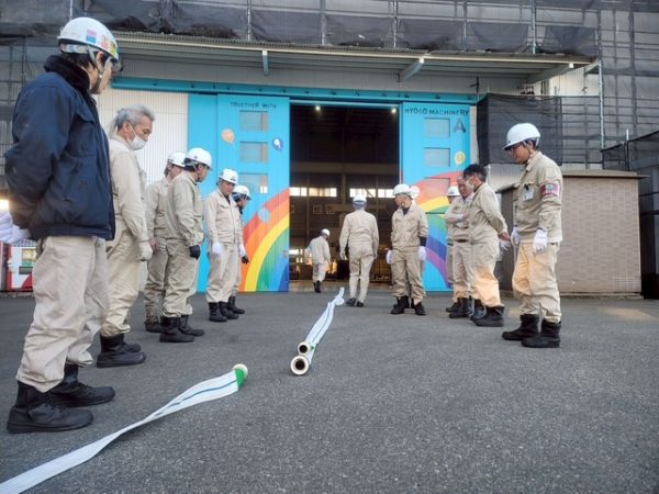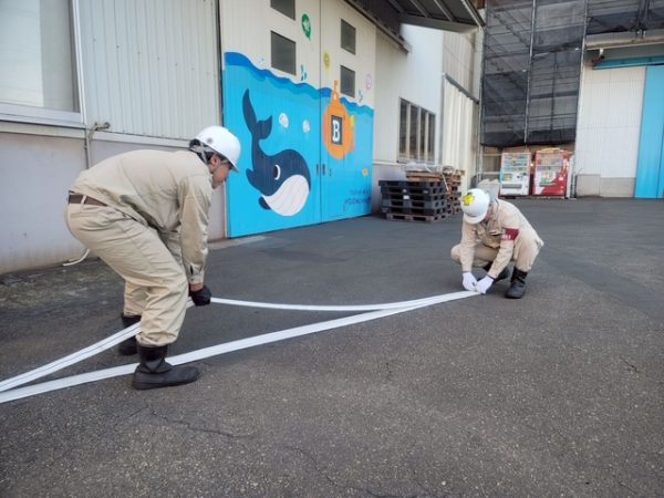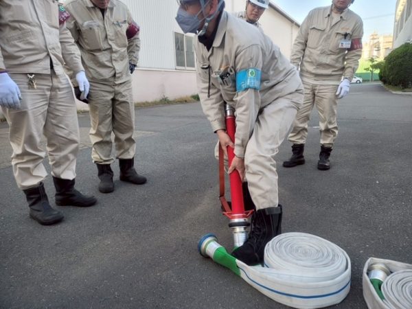 先日の避難訓練に続き、今回は防火水槽のホースの確認を行いました。